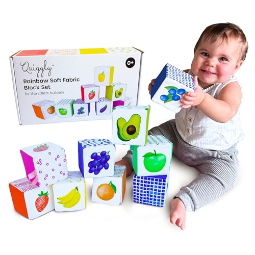 Quiggly Rainbow Soft Baby Blocks – 8 Colorful, Montessori Sensory Blocks for Babies & Toddlers- 100% Cotton, Non-Toxic Play Set with Rattle, Crinkle, Textures- Stacking Building Blocks for 3-12 Months
